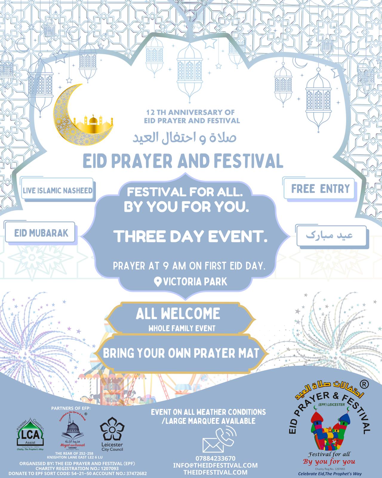 THE 10TH ANNIVERSARY OF THE EPF Expected Date: Either Sunday 16th June or Monday 17th June 2024 Event: Two days. Time: First day from 9am-9pm. Second day from 12pm-9pm. Venue: Victoria Park Leicester LE1 7RY Introduction: The ‘Eid Prayer and Festival®’ is an event that takes place twice a year.…